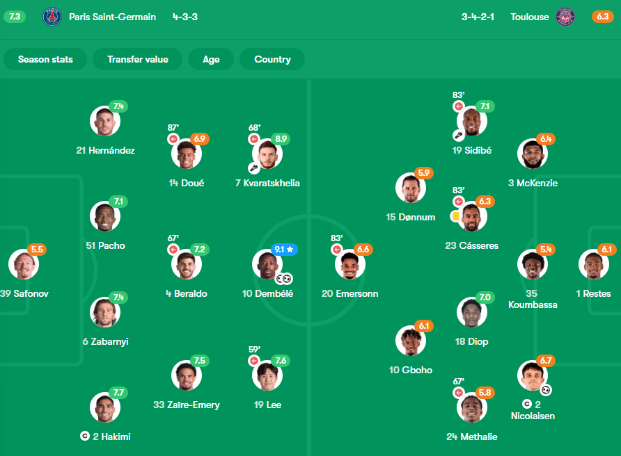 PARIS SAINT-GERMAIN XI (3-4-3): Matvey Safonov; Beraldo, Willian Pacho, Illia Zabarnyi; Lucas Hernandez, Lee Kang-In, Warren Zaire-Emery, Achraf Hakimi; Khvicha Kvaratskhelia, Ousmane Dembele, Desire Doue.